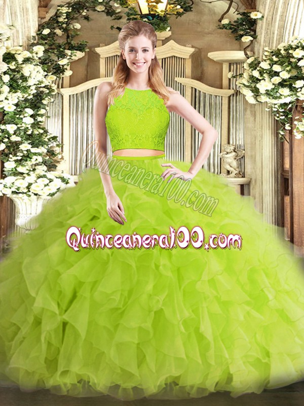 Neckline : ScoopShown Color : Yellow GreenSilhouette : Two PiecesSleeve Length : sleevelessHemline : floor lengthBack Detail : ZipperFabric : TulleEmbellishment : RufflesOccasion : Military Ball,Sweet 16,QuinceaneraSeason : Spring,Summer,Fall,Winter