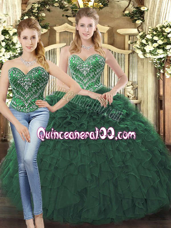 Neckline : SweetheartShown Color : Dark GreenSilhouette : Ball GownsSleeve Length : sleevelessHemline : floor lengthBack Detail : Lace upFabric : TulleEmbellishment : Beading,RufflesOccasion : Military Ball,Sweet 16,QuinceaneraSeason : Spring,Summer,Fall,Winter