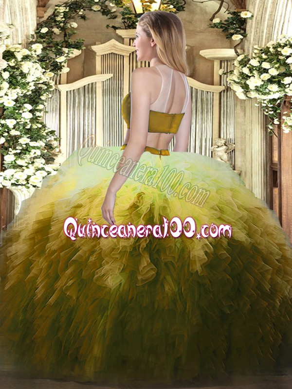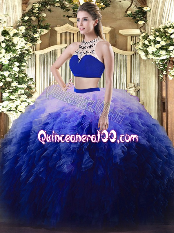 Neckline : High-neckShown Color : Multi-colorSilhouette : Two PiecesSleeve Length : sleevelessHemline : floor lengthBack Detail : BacklessFabric : TulleEmbellishment : Beading,RufflesOccasion : Military Ball,Sweet 16,QuinceaneraSeason : Spring,Summer,Fall,Winter