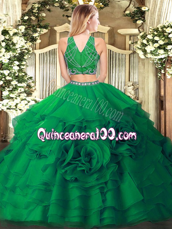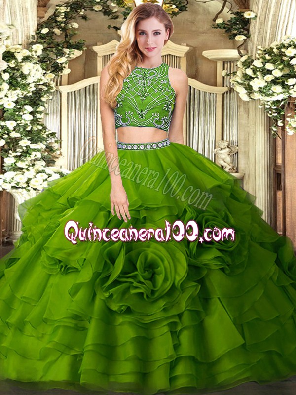Neckline : High-neckShown Color : Olive GreenSilhouette : Two PiecesSleeve Length : sleevelessHemline : floor lengthBack Detail : ZipperFabric : TulleEmbellishment : Beading,Ruffled LayersOccasion : Military Ball,Sweet 16,QuinceaneraSeason : Spring,Summer,Fall,Winter