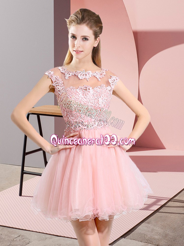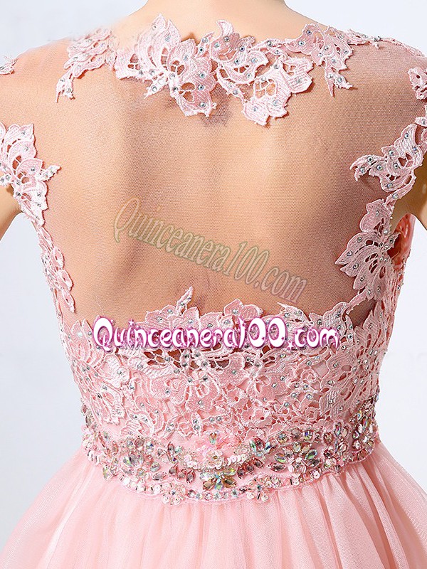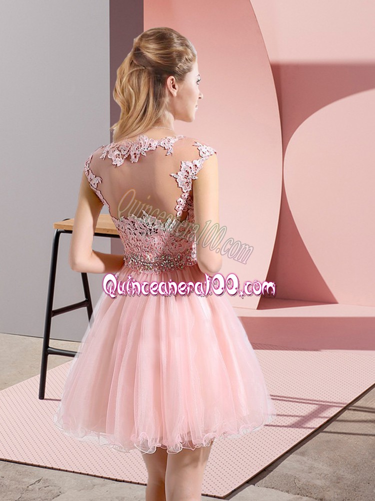 Neckline : ScoopShown Color : Baby PinkSilhouette : A-lineSleeve Length : sleevelessHemline : knee lengthBack Detail : Side zipperFabric : TulleEmbellishment : Beading,LaceOccasion : Prom,Party,Wedding PartySeason : Spring,Summer,Fall