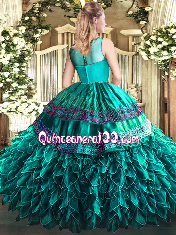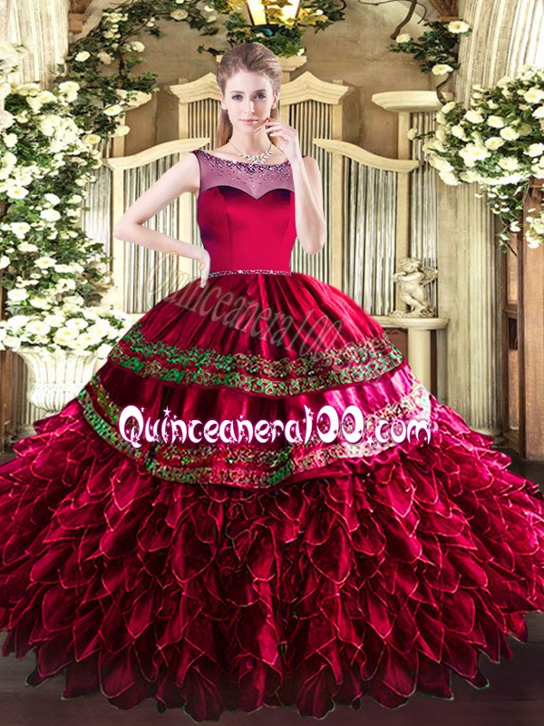 Neckline : ScoopShown Color : Coral RedSilhouette : Ball GownsSleeve Length : sleevelessHemline : floor lengthBack Detail : ZipperFabric : OrganzaEmbellishment : Beading,RufflesOccasion : Sweet 16,QuinceaneraSeason : Spring,Summer,Fall,Winter