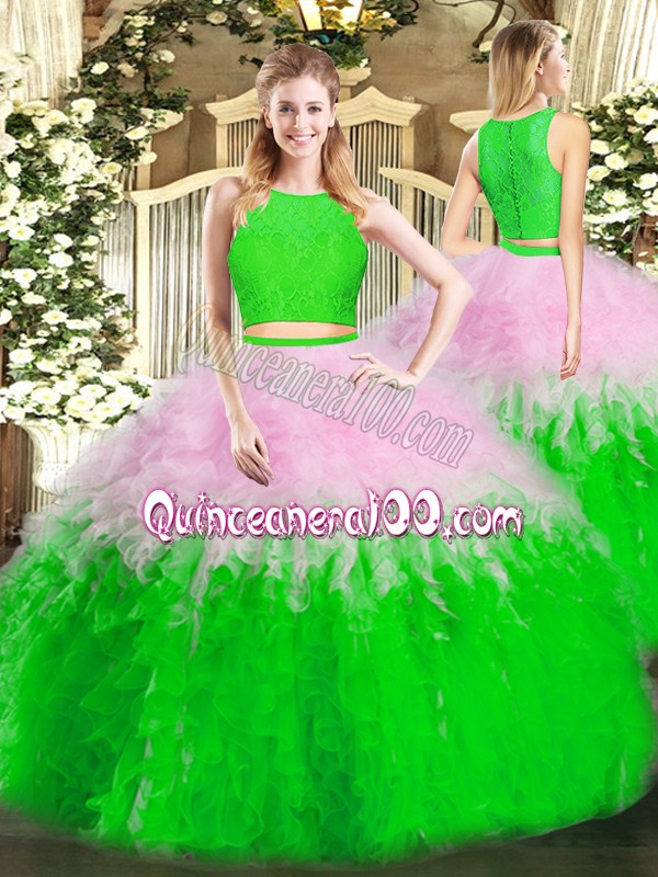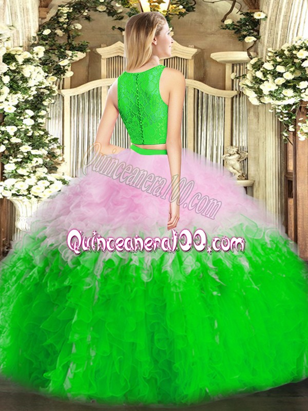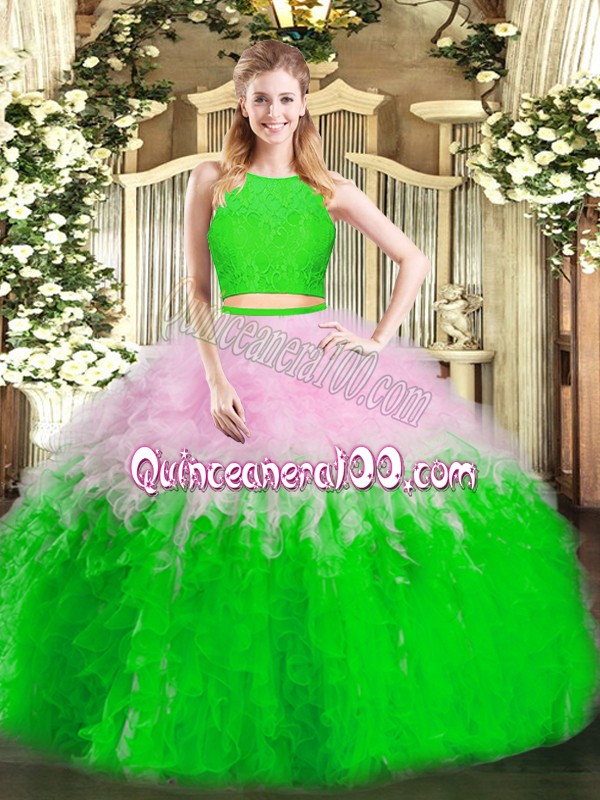 Neckline : ScoopShown Color : Multi-colorSilhouette : Two PiecesSleeve Length : sleevelessHemline : floor lengthBack Detail : ZipperFabric : TulleEmbellishment : RufflesOccasion : Military Ball,Sweet 16,QuinceaneraSeason : Spring,Summer,Fall,Winter