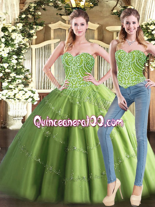 Neckline : SweetheartShown Color : Olive GreenSilhouette : Ball GownsSleeve Length : sleevelessHemline : floor lengthBack Detail : Lace upFabric : TulleEmbellishment : BeadingOccasion : Military Ball,Sweet 16,QuinceaneraSeason : Spring,Summer,Fall,Winter