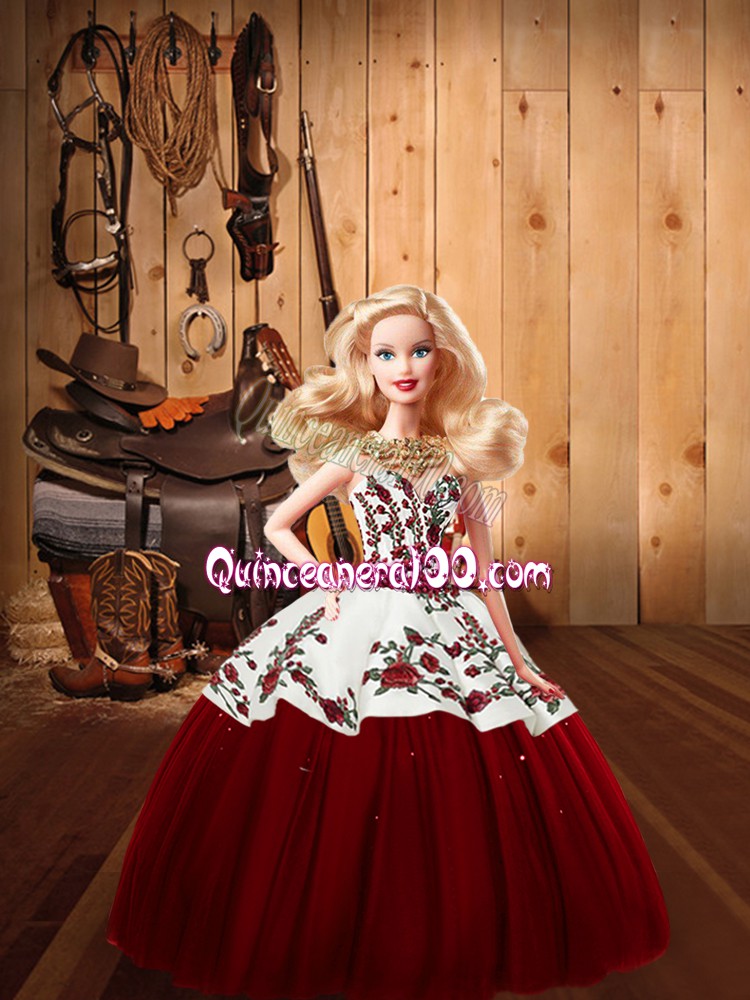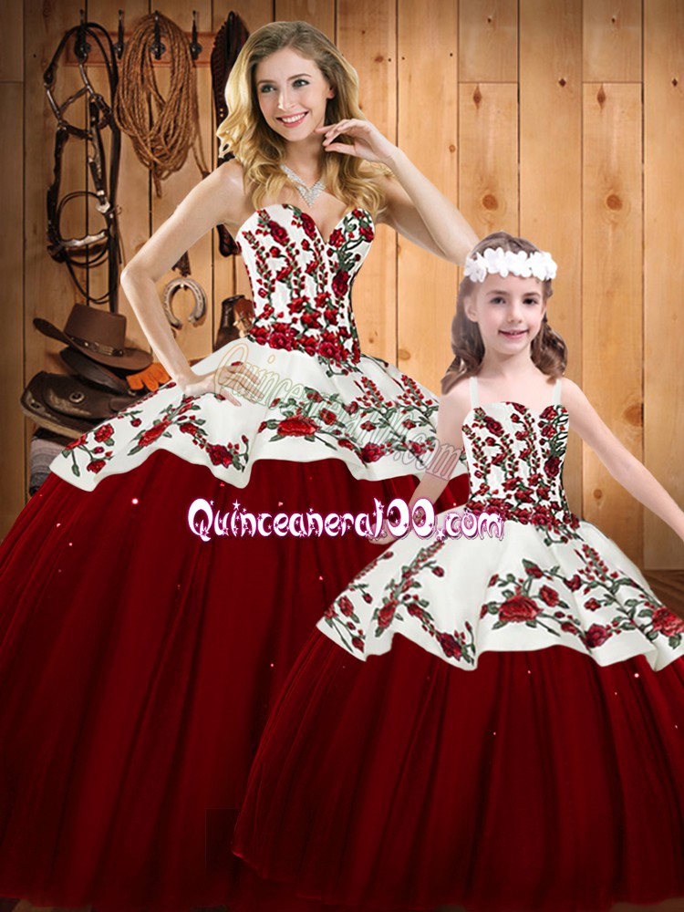 Neckline : SweetheartShown Color : Wine RedSilhouette : Ball GownsSleeve Length : sleevelessHemline : floor lengthBack Detail : Lace upFabric : TulleEmbellishment : EmbroideryOccasion : Military Ball,Sweet 16,QuinceaneraSeason : Spring,Summer,Fall,Winter