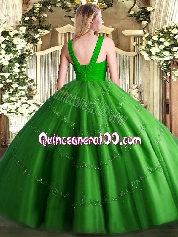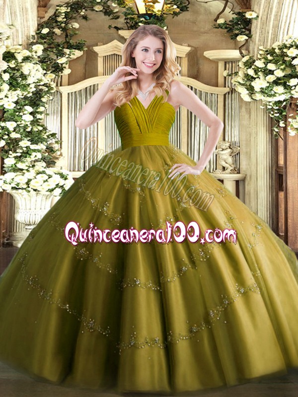 Neckline : V-neckShown Color : Olive GreenSilhouette : Ball GownsSleeve Length : sleevelessHemline : floor lengthBack Detail : ZipperFabric : TulleEmbellishment : BeadingOccasion : Military Ball,Sweet 16,QuinceaneraSeason : Spring,Summer,Fall,Winter