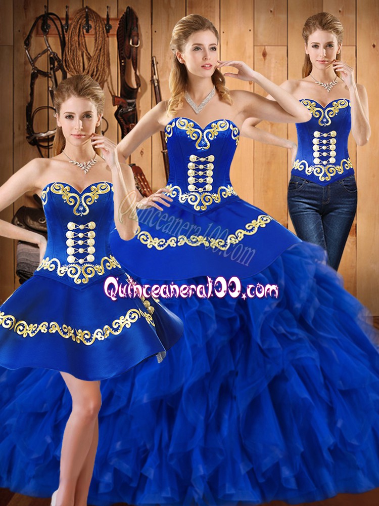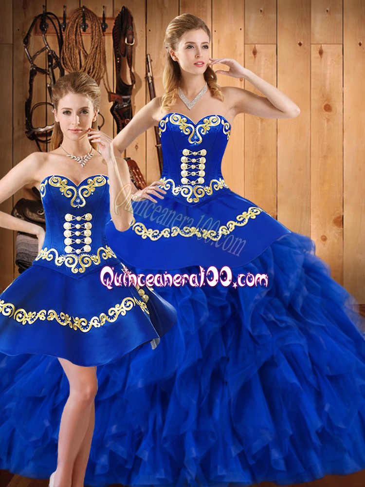 Neckline : SweetheartShown Color : BlueSilhouette : Three PiecesSleeve Length : sleevelessHemline : floor lengthBack Detail : Lace upFabric : Satin,OrganzaEmbellishment : Embroidery,RufflesOccasion : Military Ball,Sweet 16,QuinceaneraSeason : Spring,Summer,Fall,Winter