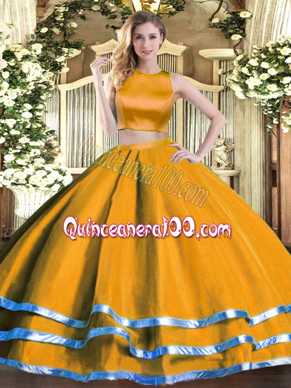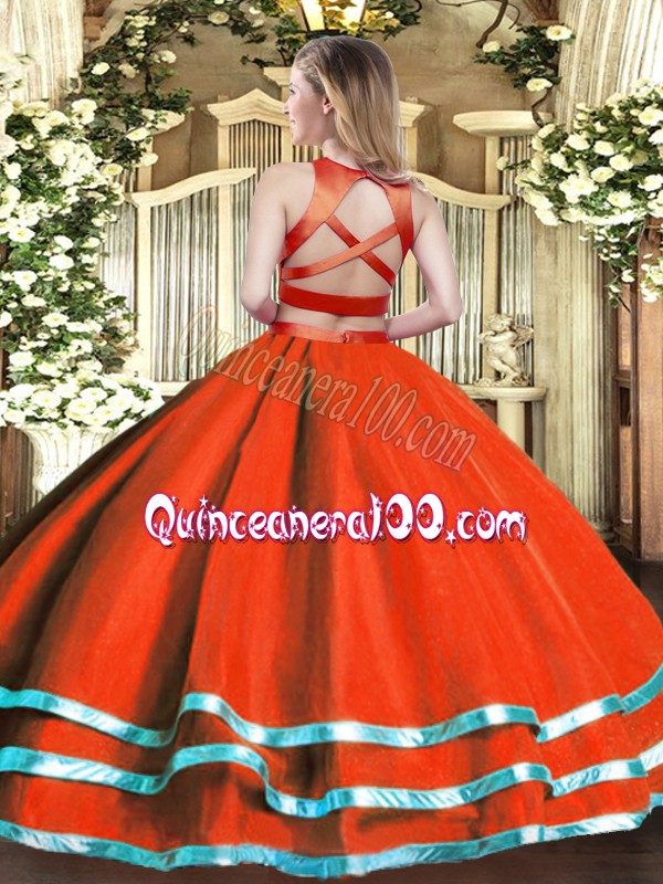 Neckline : High-neckShown Color : OrangeSilhouette : Two PiecesSleeve Length : sleevelessHemline : floor lengthBack Detail : Criss crossFabric : TulleEmbellishment : RuchingOccasion : Military Ball,Sweet 16,QuinceaneraSeason : Spring,Summer,Fall,Winter