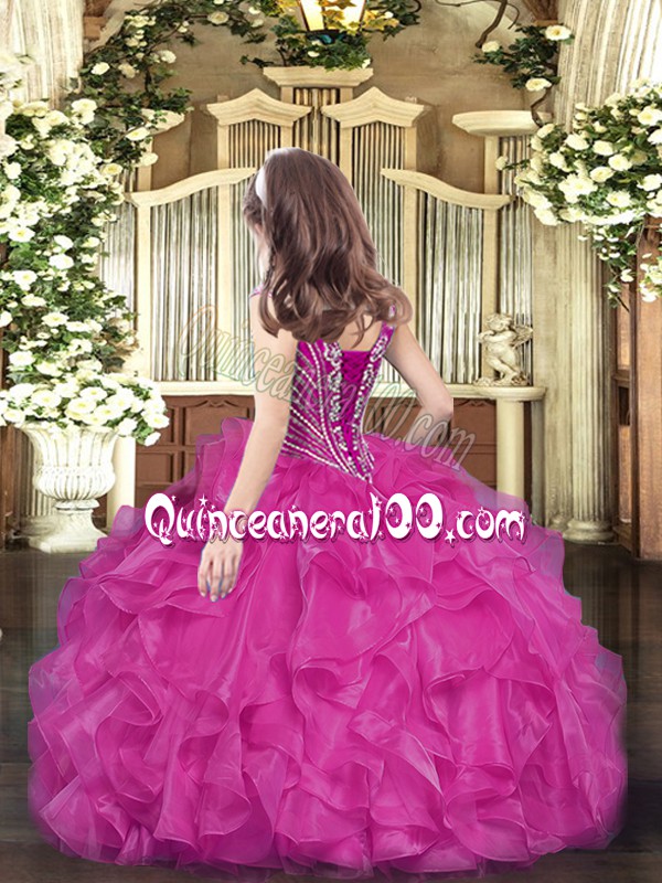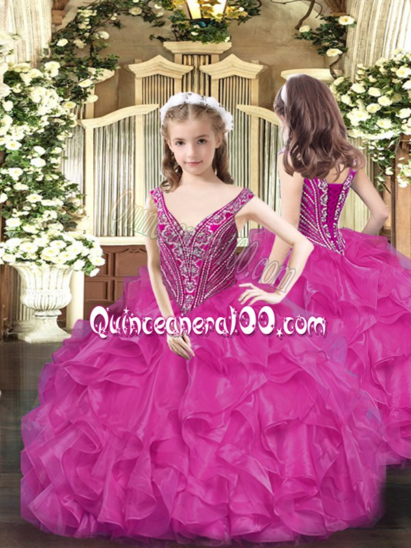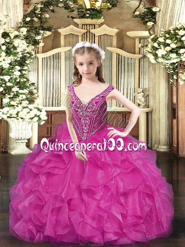 Neckline : V-neckShown Color : FuchsiaSilhouette : Ball GownsSleeve Length : sleevelessHemline : floor lengthBack Detail : Lace upFabric : OrganzaEmbellishment : Beading,RufflesOccasion : Party,QuinceaneraSeason : Spring,Summer,Fall,Winter
