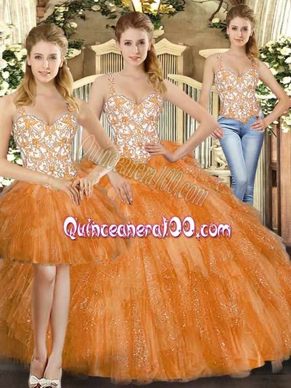 Neckline : StrapsShown Color : Orange RedSilhouette : Three PiecesSleeve Length : sleevelessHemline : floor lengthBack Detail : Lace upFabric : OrganzaEmbellishment : Beading,RufflesOccasion : Military Ball,Sweet 16,QuinceaneraSeason : Spring,Summer,Fall,Winter