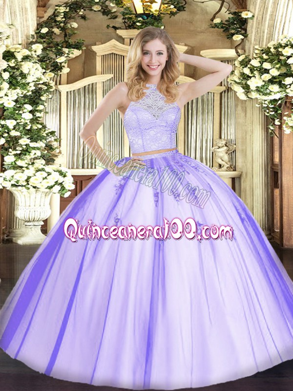 Neckline : ScoopShown Color : LavenderSilhouette : Two PiecesSleeve Length : sleevelessHemline : floor lengthBack Detail : ZipperFabric : TulleEmbellishment : Lace,AppliquesOccasion : Military Ball,Sweet 16,QuinceaneraSeason : Spring,Summer,Fall,Winter