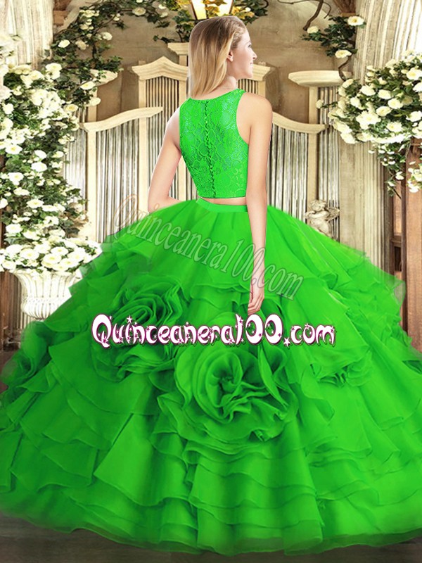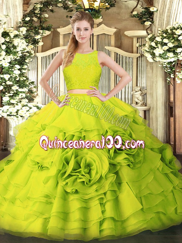 Neckline : ScoopShown Color : Yellow GreenSilhouette : Two PiecesSleeve Length : sleevelessHemline : floor lengthBack Detail : ZipperFabric : TulleEmbellishment : RufflesOccasion : Military Ball,Sweet 16,QuinceaneraSeason : Spring,Summer,Fall,Winter