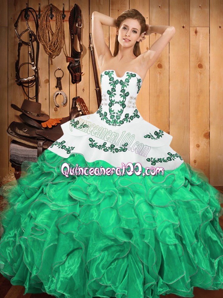 Neckline : StraplessShown Color : TurquoiseSilhouette : Ball GownsSleeve Length : sleevelessHemline : floor lengthBack Detail : Lace upFabric : Satin,OrganzaEmbellishment : Embroidery,RufflesOccasion : Military Ball,Sweet 16,QuinceaneraSeason : Spring,Summer,Fall,Winter
