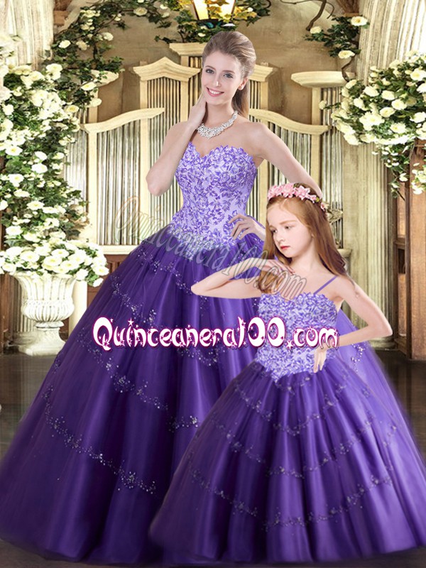 Hot Sale Purple Tulle Lace Up Sweetheart Sleeveless Floor Length Sweet 16 Quinceanera Dress Beading