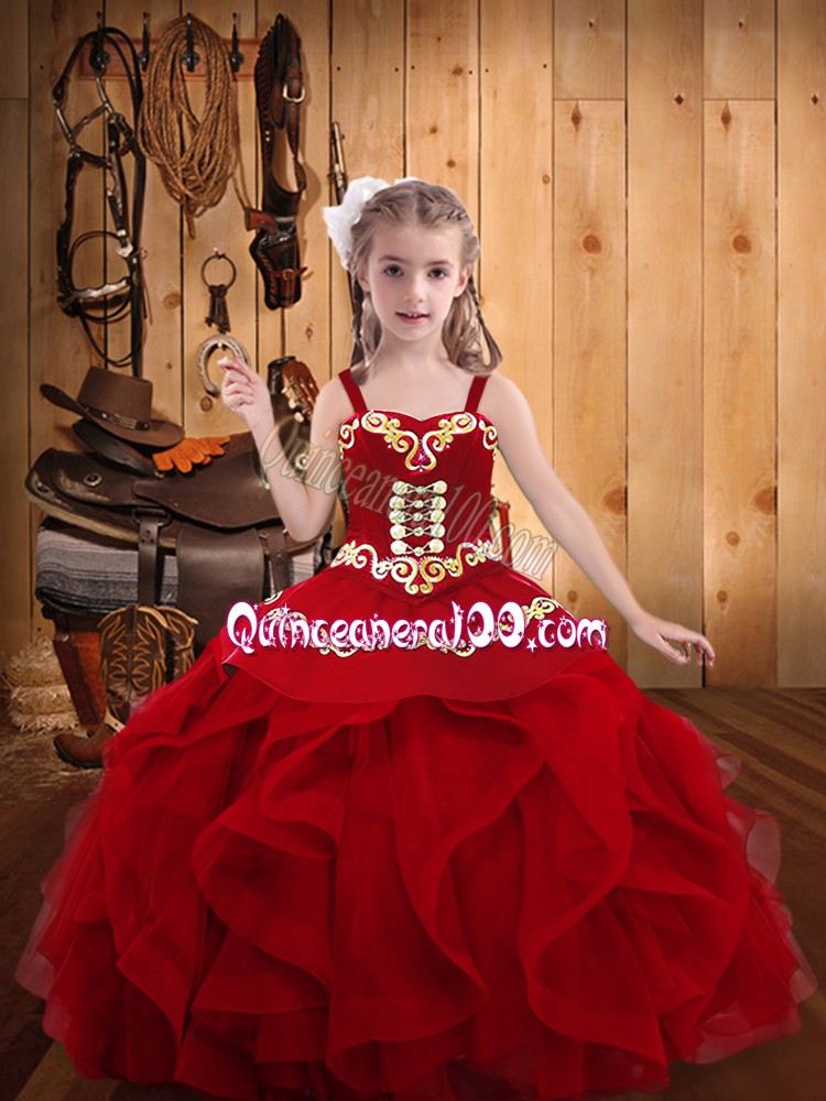 Neckline : StrapsShown Color : Wine RedSilhouette : Ball GownsSleeve Length : sleevelessHemline : floor lengthBack Detail : Lace upFabric : OrganzaEmbellishment : Embroidery,RufflesOccasion : Sweet 16,QuinceaneraSeason : Spring,Summer,Fall,Winter