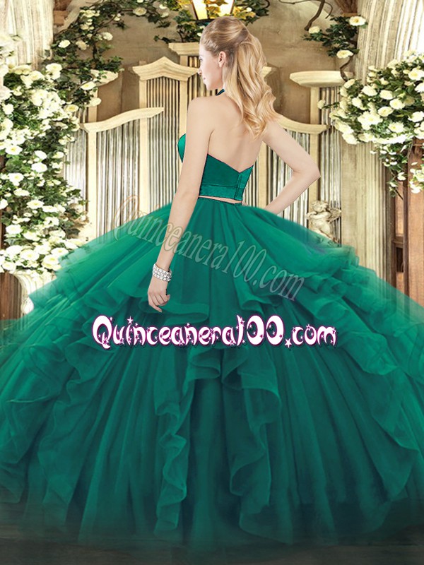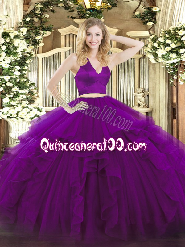 Neckline : Halter topShown Color : PurpleSilhouette : Two PiecesSleeve Length : sleevelessHemline : floor lengthBack Detail : ZipperFabric : OrganzaEmbellishment : RufflesOccasion : Military Ball,Sweet 16,QuinceaneraSeason : Spring,Summer,Fall,Winter