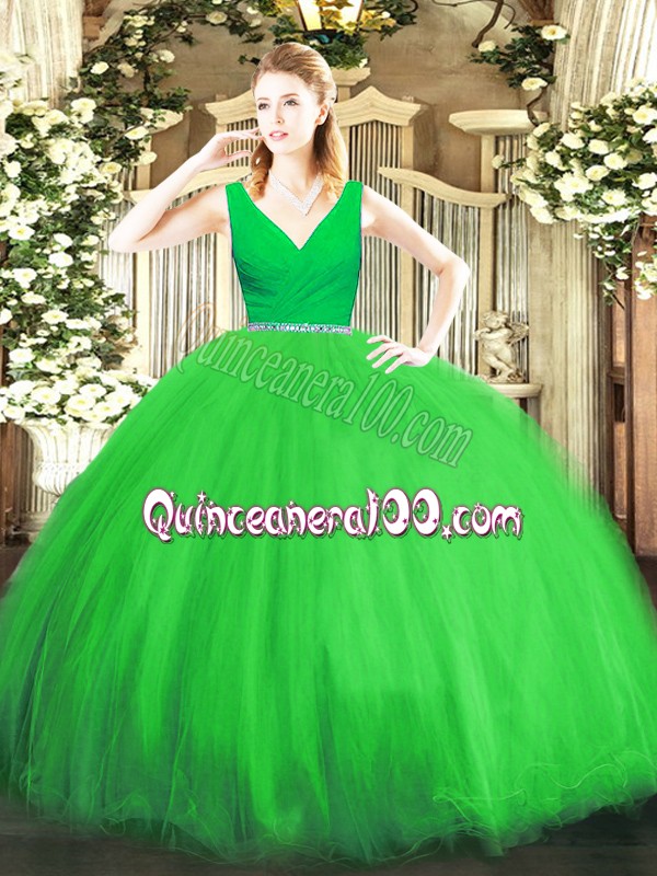 Neckline : V-neckShown Color : Spring GreenSilhouette : Ball GownsSleeve Length : sleevelessHemline : floor lengthBack Detail : ZipperFabric : TulleEmbellishment : BeadingOccasion : Military Ball,Sweet 16,QuinceaneraSeason : Spring,Summer,Fall,Winter