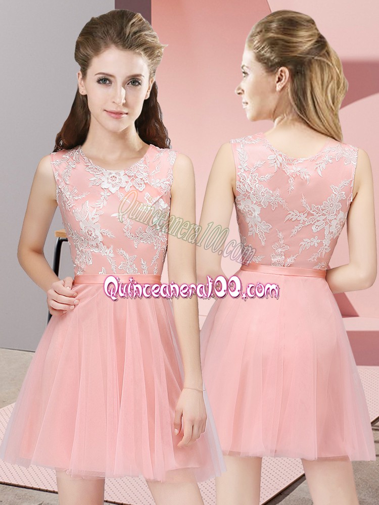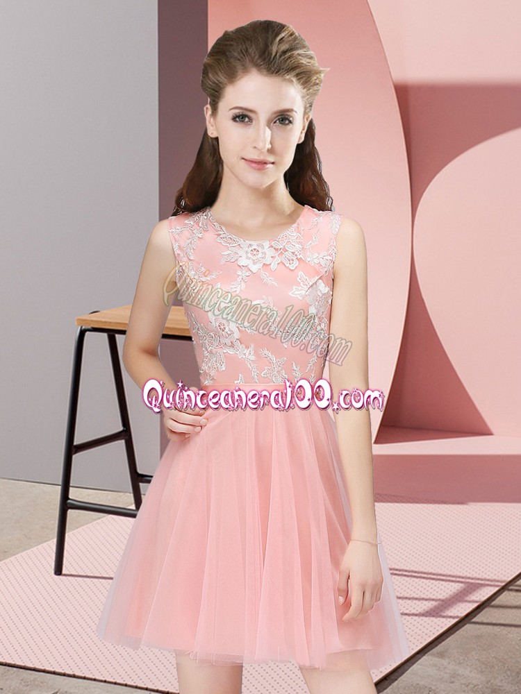 Neckline : ScoopShown Color : Baby PinkSilhouette : A-lineSleeve Length : sleevelessHemline : mini lengthBack Detail : Side zipperFabric : TulleEmbellishment : LaceOccasion : Prom,Party,Wedding PartySeason : Spring,Summer,Fall