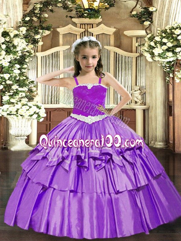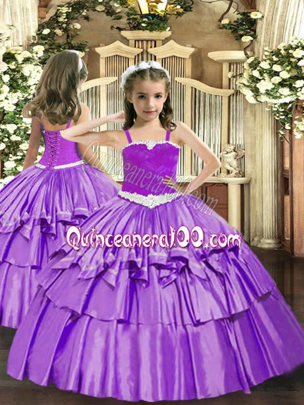Neckline : StrapsShown Color : LavenderSilhouette : Ball GownsSleeve Length : sleevelessHemline : floor lengthBack Detail : Lace upFabric : OrganzaEmbellishment : Appliques,Ruffled LayersOccasion : Party,QuinceaneraSeason : Spring,Summer,Fall,Winter