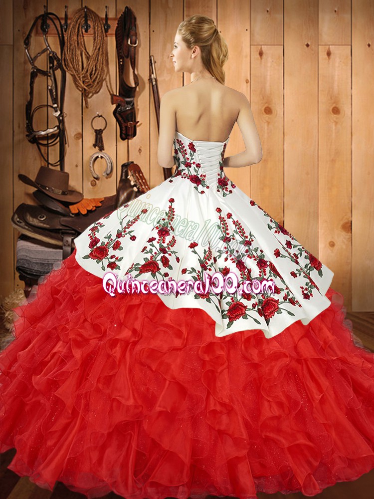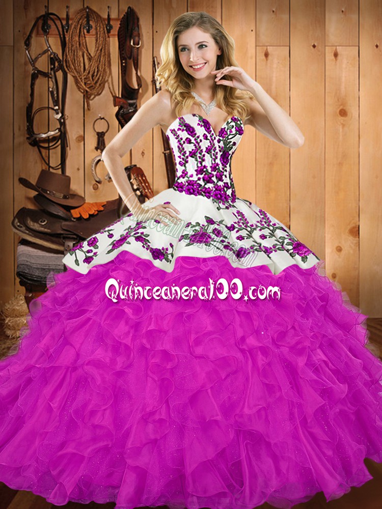 Neckline : SweetheartShown Color : FuchsiaSilhouette : Ball GownsSleeve Length : sleevelessHemline : floor lengthBack Detail : Lace upFabric : TulleEmbellishment : Embroidery,RufflesOccasion : Military Ball,Sweet 16,QuinceaneraSeason : Spring,Summer,Fall,Winter