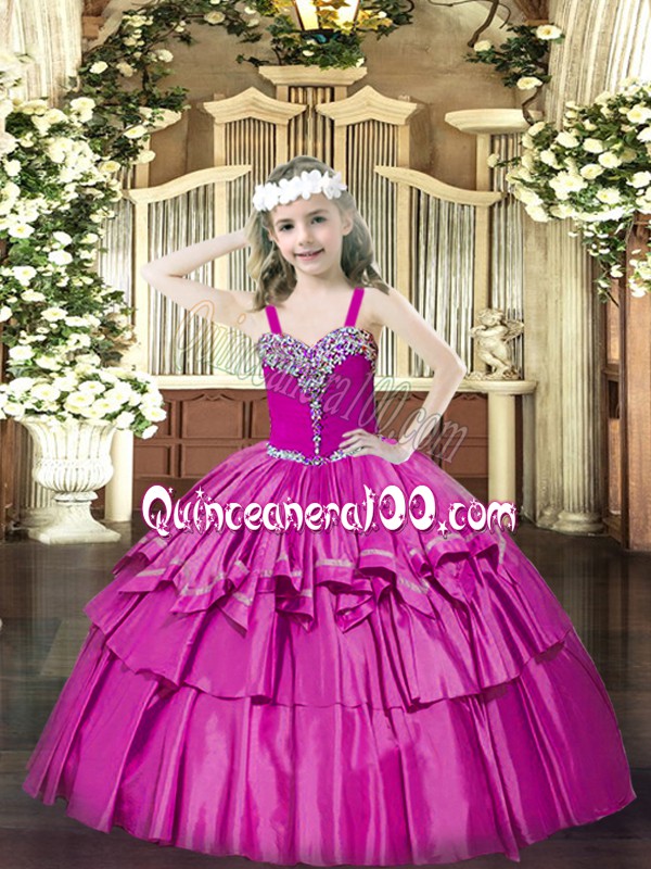 Neckline : StrapsShown Color : FuchsiaSilhouette : Ball GownsSleeve Length : sleevelessHemline : floor lengthBack Detail : Lace upFabric : OrganzaEmbellishment : Beading,Ruffled LayersOccasion : Party,QuinceaneraSeason : Spring,Summer,Fall,Winter