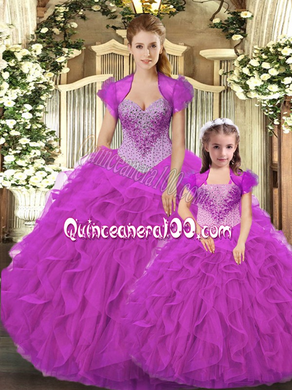 Neckline : StrapsShown Color : FuchsiaSilhouette : Ball GownsSleeve Length : sleevelessHemline : floor lengthBack Detail : Lace upFabric : TulleEmbellishment : Beading,RufflesOccasion : Military Ball,Sweet 16,QuinceaneraSeason : Spring,Summer,Fall,Winter