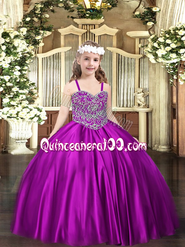 Neckline : StrapsShown Color : PurpleSilhouette : Ball GownsSleeve Length : sleevelessHemline : floor lengthBack Detail : Lace upFabric : SatinEmbellishment : BeadingOccasion : Party,QuinceaneraSeason : Spring,Summer,Fall,Winter