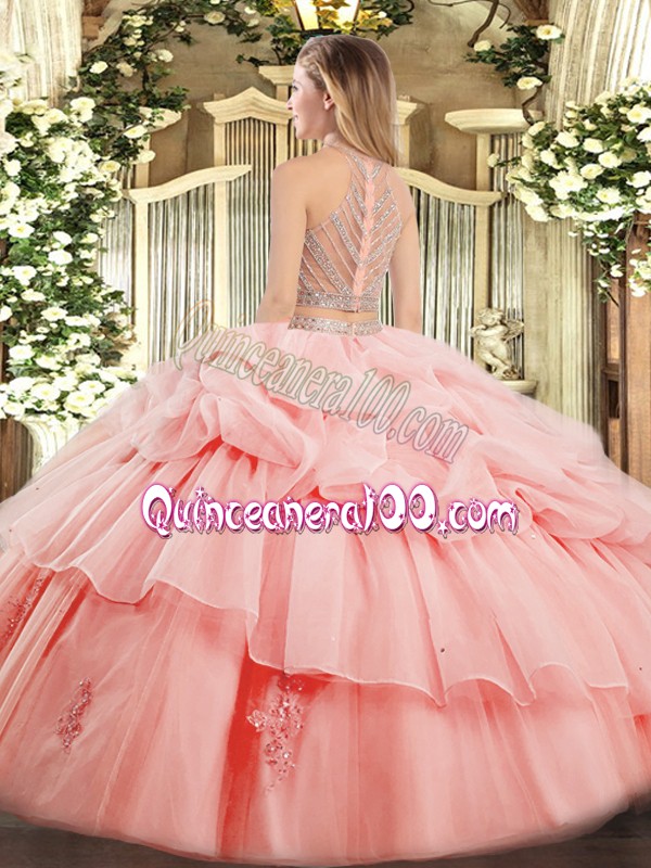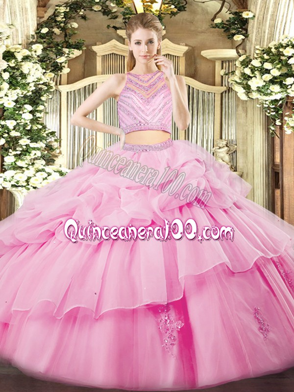 Neckline : High-neckShown Color : Rose Pink Silhouette : Two PiecesSleeve Length : sleevelessHemline : floor lengthBack Detail : ZipperFabric : TulleEmbellishment : Beading,RufflesOccasion : Military Ball,Sweet 16,QuinceaneraSeason : Spring,Summer,Fall,Winter