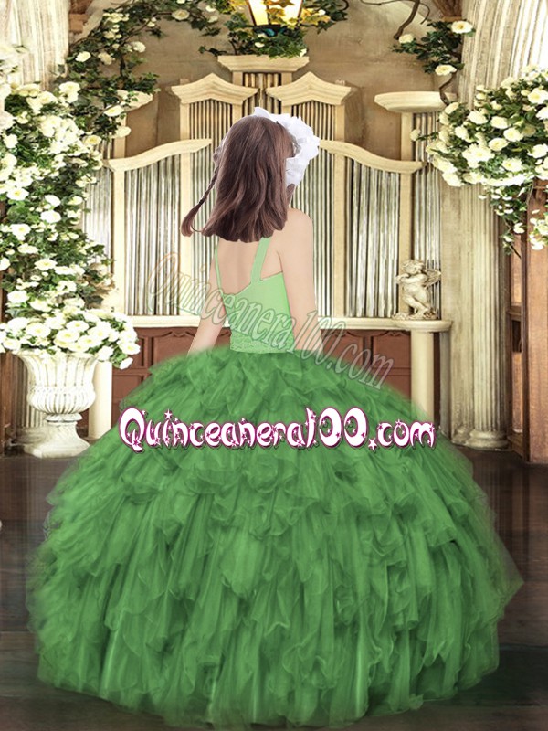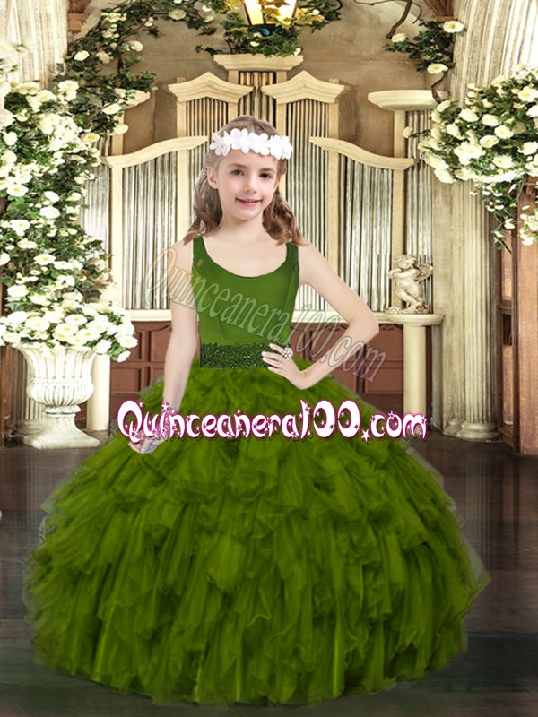 Neckline : ScoopShown Color : Olive GreenSilhouette : Ball GownsSleeve Length : sleevelessHemline : floor lengthBack Detail : ZipperFabric : OrganzaEmbellishment : Beading,RufflesOccasion : Party,QuinceaneraSeason : Spring,Summer,Fall,Winter