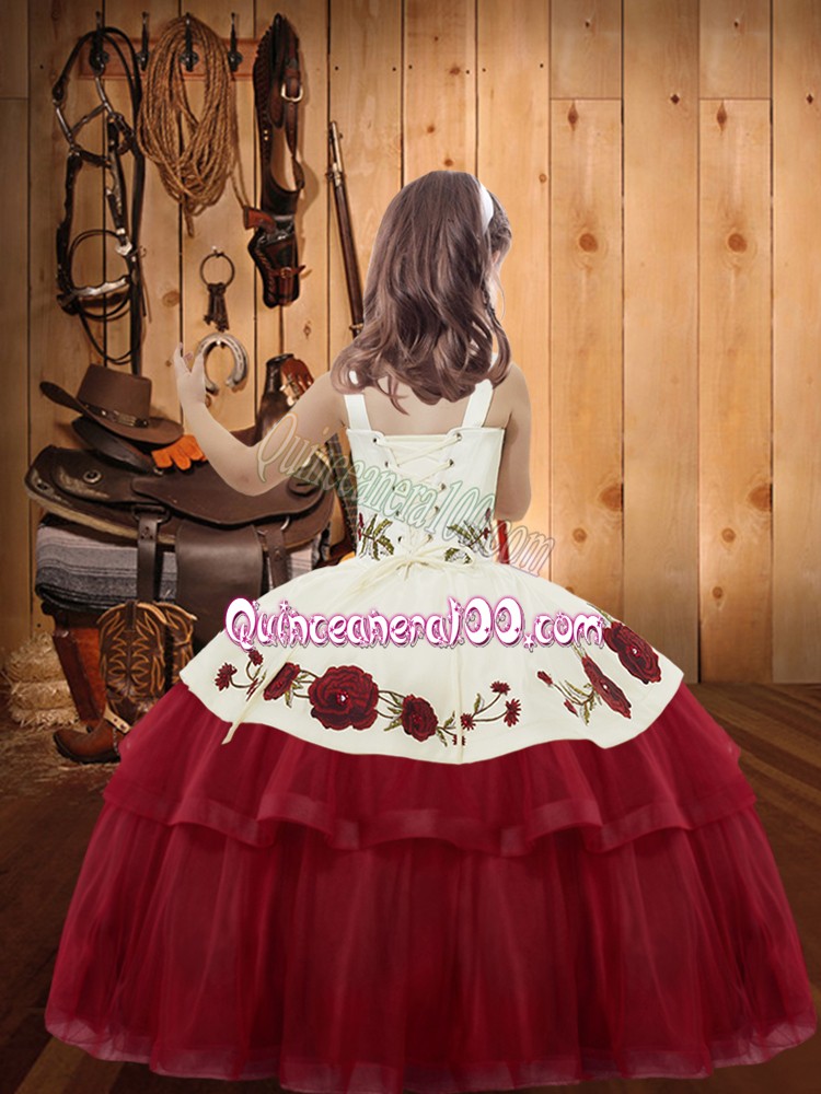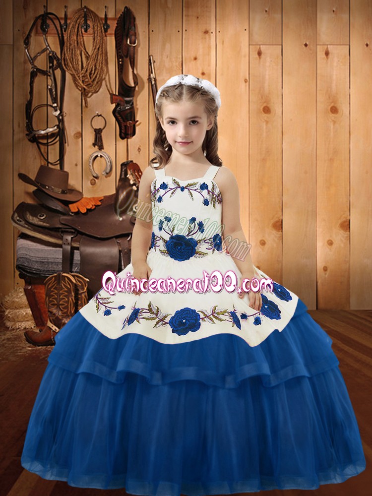 Neckline : StrapsShown Color : BlueSilhouette : Ball GownsSleeve Length : sleevelessHemline : floor lengthBack Detail : Lace upFabric : OrganzaEmbellishment : Embroidery,Ruffled LayersOccasion : Sweet 16,QuinceaneraSeason : Spring,Summer,Fall,Winter