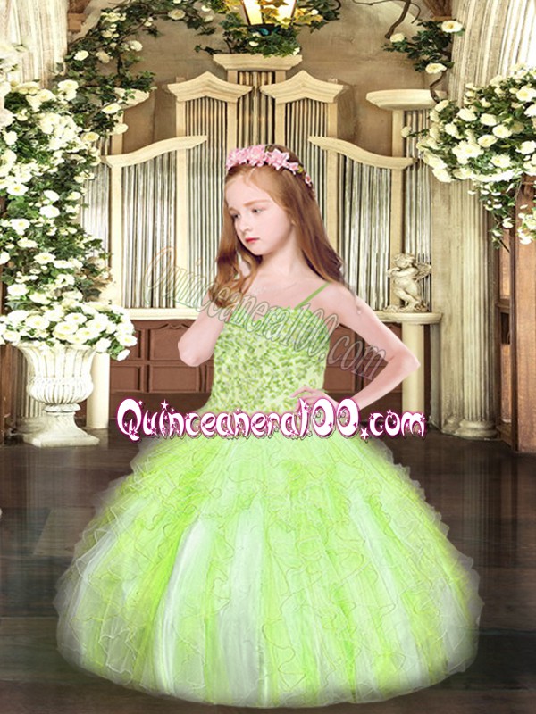 Neckline : Spaghetti strapsShown Color : Yellow GreenSilhouette : Ball GownsSleeve Length : sleevelessHemline : floor lengthBack Detail : Lace upFabric : OrganzaEmbellishment : Appliques,RufflesOccasion : Party,QuinceaneraSeason : Spring,Summer,Fall,Winter
