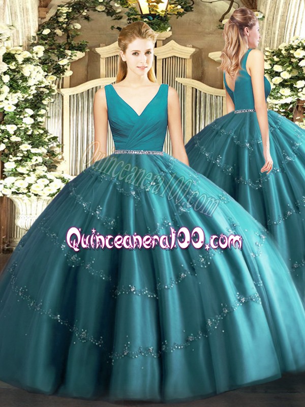 Neckline : V-neckShown Color : Teal Silhouette : Ball GownsSleeve Length : sleevelessHemline : floor lengthBack Detail : ZipperFabric : TulleEmbellishment : BeadingOccasion : Military Ball,Sweet 16,QuinceaneraSeason : Spring,Summer,Fall,Winter