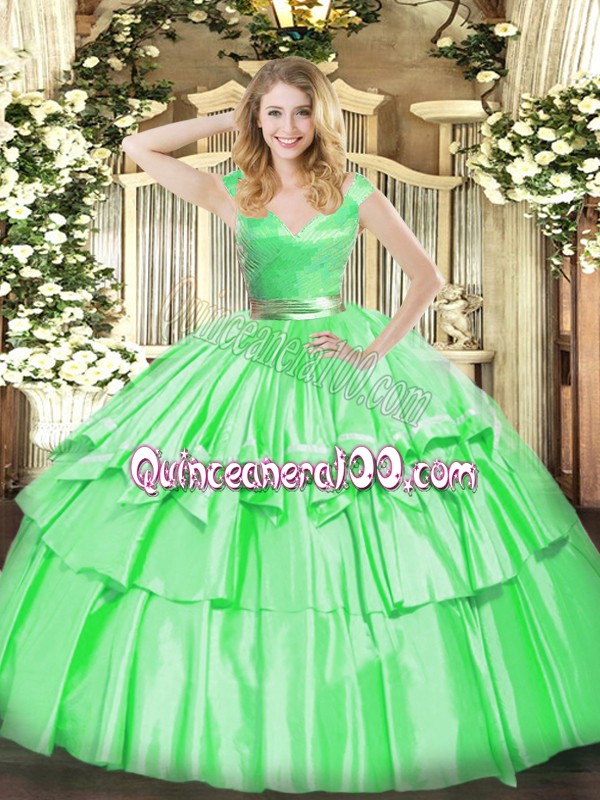 Neckline : V-neckShown Color : Spring GreenSilhouette : Ball GownsSleeve Length : sleevelessHemline : floor lengthBack Detail : ZipperFabric : TulleEmbellishment : Beading,Ruffled LayersOccasion : Military Ball,Sweet 16,QuinceaneraSeason : Spring,Summer,Fall,Winter