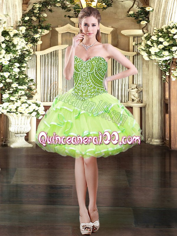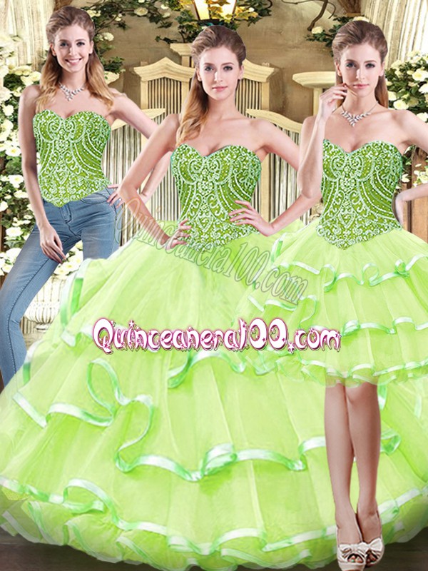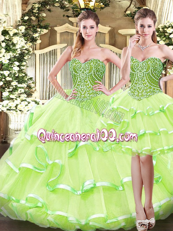 Neckline : SweetheartShown Color : Yellow GreenSilhouette : Three PiecesSleeve Length : sleevelessHemline : floor lengthBack Detail : Lace upFabric : OrganzaEmbellishment : Ruffled LayersOccasion : Military Ball,Sweet 16,QuinceaneraSeason : Spring,Summer,Fall,Winter