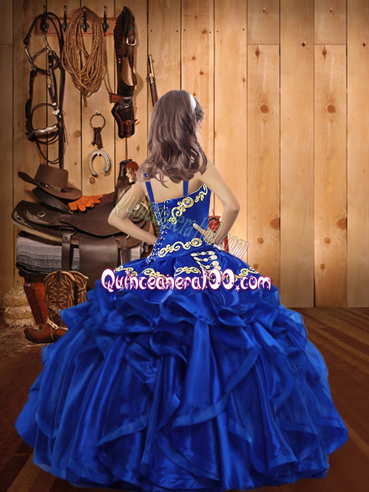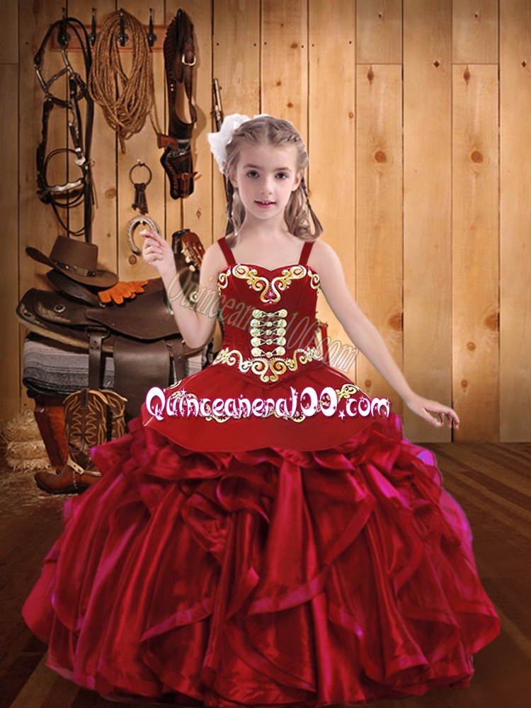 Neckline : StrapsShown Color : RedSilhouette : Ball GownsSleeve Length : sleevelessBack Detail : Lace upFabric : OrganzaEmbellishment : Embroidery,RufflesOccasion : Party,Sweet 16,Wedding PartySeason : Spring,Summer,Fall,Winter