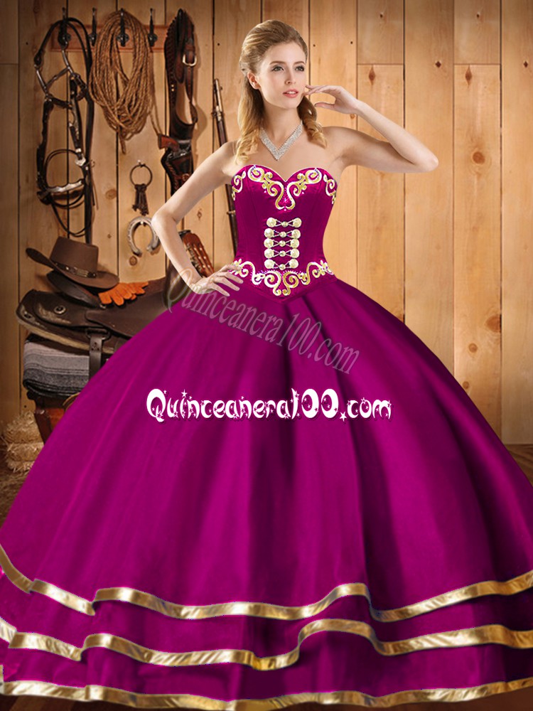 Neckline : SweetheartShown Color : FuchsiaSilhouette : Ball GownsSleeve Length : sleevelessHemline : floor lengthBack Detail : Lace upFabric : OrganzaEmbellishment : EmbroideryOccasion : Military Ball,Sweet 16,QuinceaneraSeason : Spring,Summer,Fall,Winter