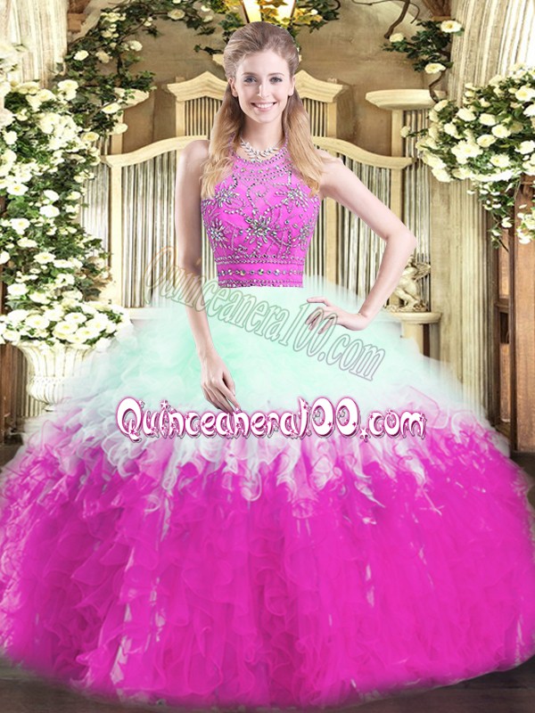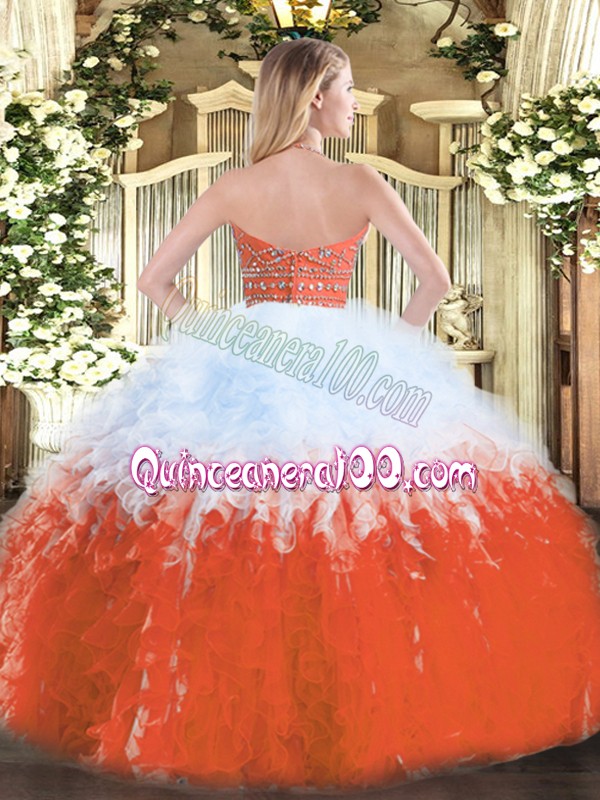 Neckline : Halter topShown Color : Multi-colorSilhouette : Ball GownsSleeve Length : sleevelessHemline : floor lengthBack Detail : ZipperFabric : TulleEmbellishment : Beading,RufflesOccasion : Military Ball,Sweet 16,QuinceaneraSeason : Spring,Summer,Fall,Winter