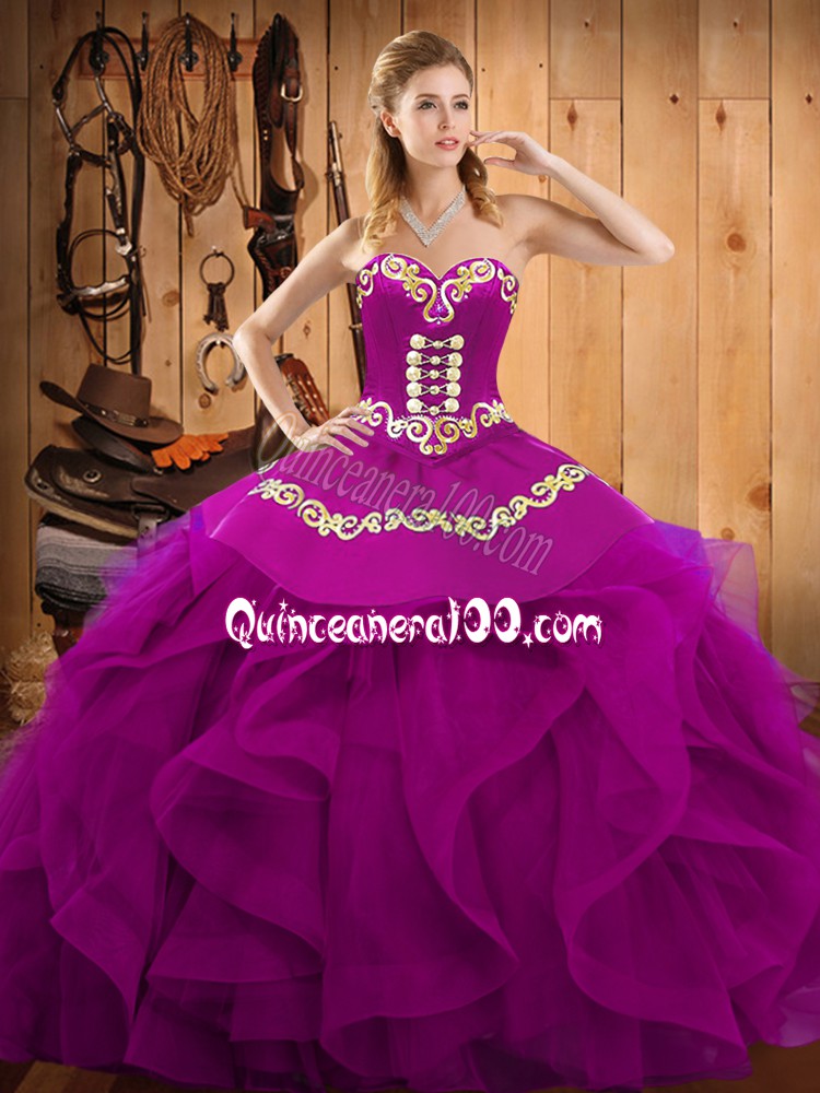 Neckline : SweetheartShown Color : FuchsiaSilhouette : Ball GownsSleeve Length : sleevelessHemline : floor lengthBack Detail : Lace upFabric : OrganzaEmbellishment : Embroidery,RufflesOccasion : Military Ball,Sweet 16,QuinceaneraSeason : Spring,Summer,Fall,Winter