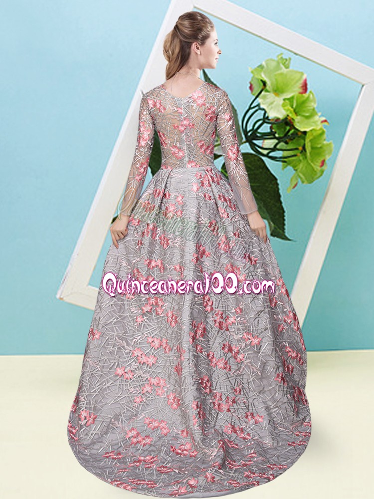 Neckline : ScoopShown Color : GreySilhouette : A-lineSleeve Length : long sleevesHemline : high lowBack Detail : ZipperFabric : LaceEmbellishment : LaceOccasion : Prom,Party,Wedding PartySeason : Spring,Summer,Fall,Winter