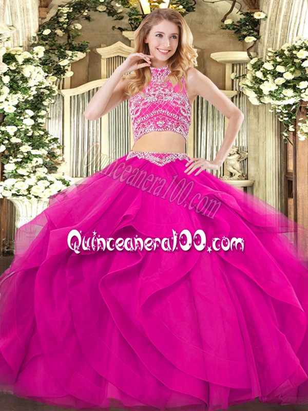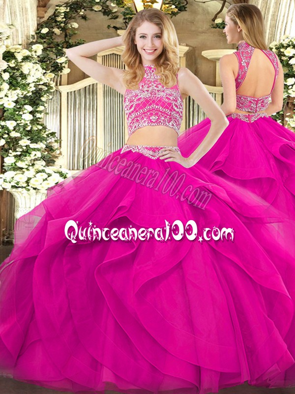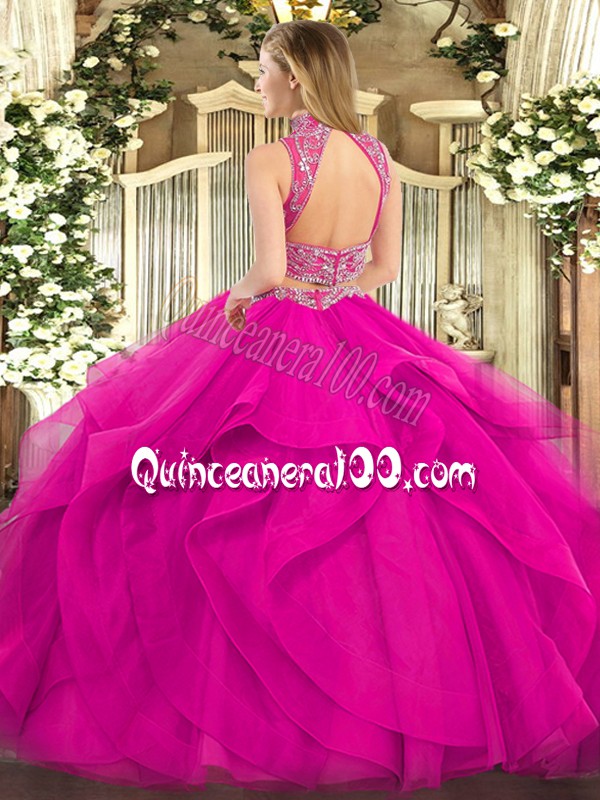 Neckline : High-neckShown Color : FuchsiaSilhouette : Two PiecesSleeve Length : sleevelessHemline : floor lengthBack Detail : BacklessFabric : TulleEmbellishment : Beading,RufflesOccasion : Military Ball,Sweet 16,QuinceaneraSeason : Spring,Summer,Fall,Winter