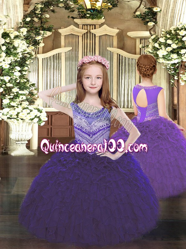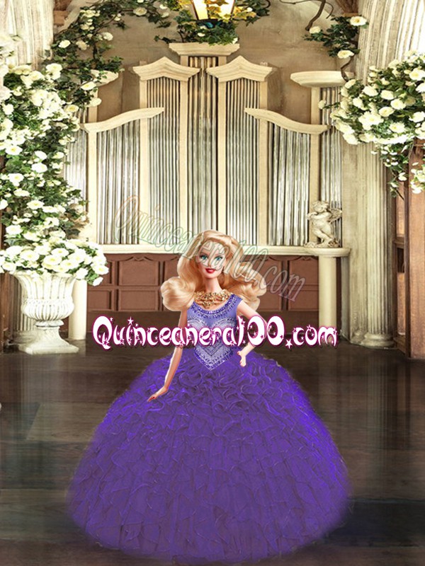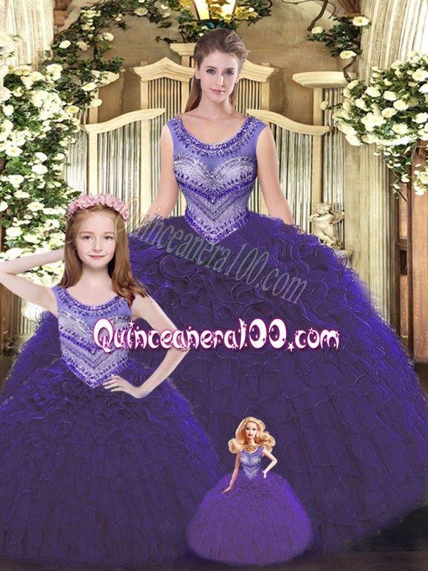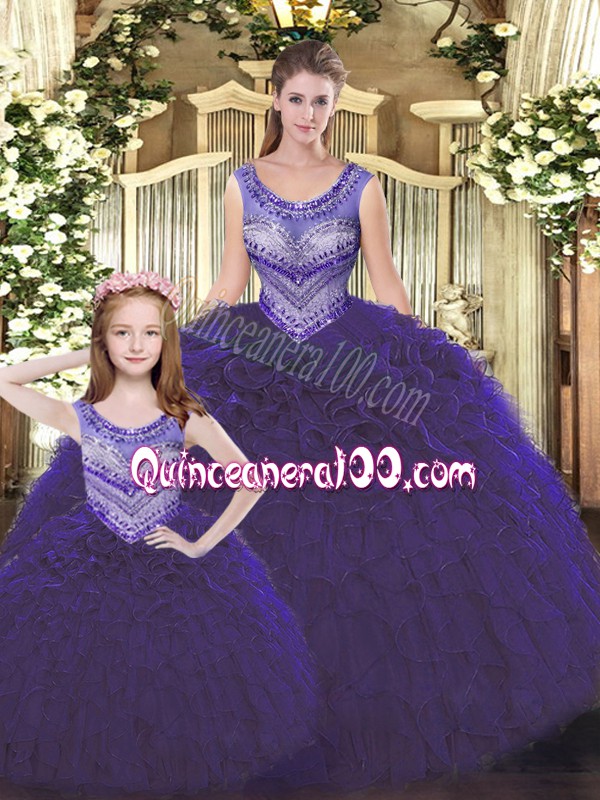 Neckline : ScoopShown Color : Dark PurpleSilhouette : Ball GownsSleeve Length : sleevelessHemline : floor lengthBack Detail : Lace upFabric : TulleEmbellishment : Beading,RufflesOccasion : Military Ball,Sweet 16,QuinceaneraSeason : Spring,Summer,Fall,Winter