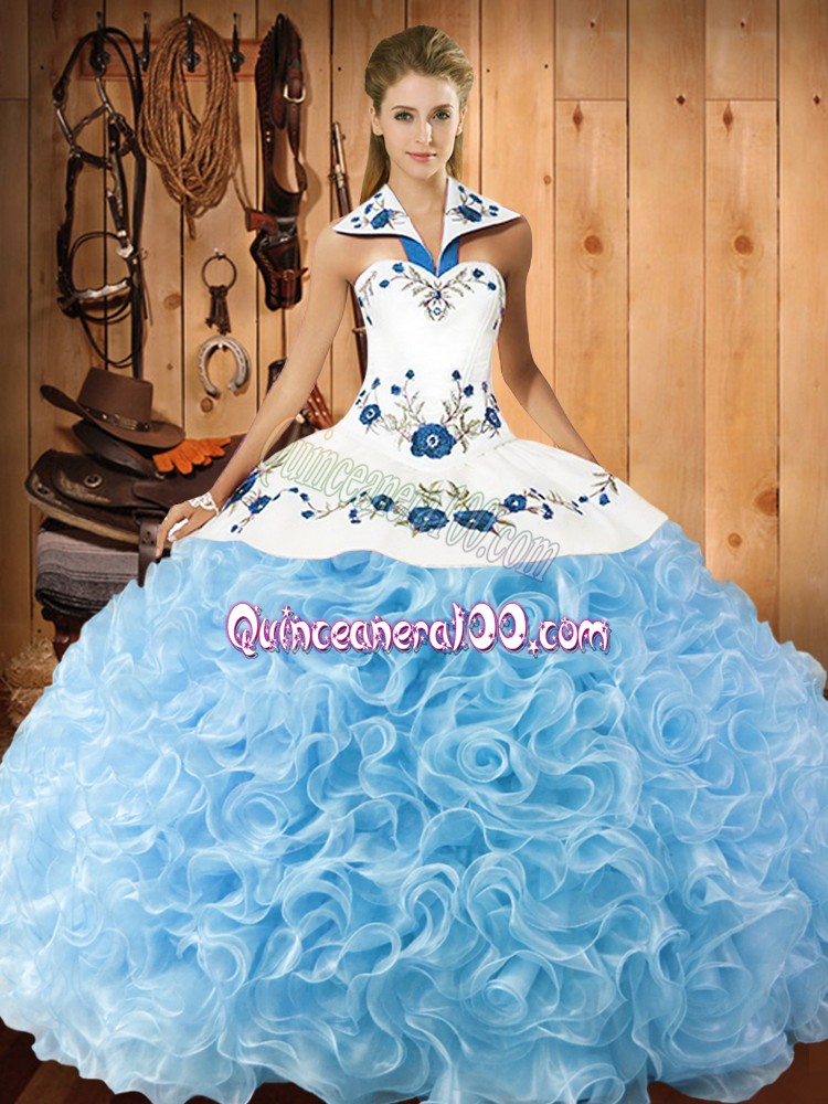 Neckline : Halter top Shown Color : Baby Blue Silhouette : Ball Gowns Sleeve Length : sleeveless Hemline : floor length Back Detail : Lace up Fabric : Fabric With Rolling Flowers Embellishment : Embroidery Occasion : Military Ball,Sweet 16,Quinceanera Season : Spring,Summer,Fall,Winter