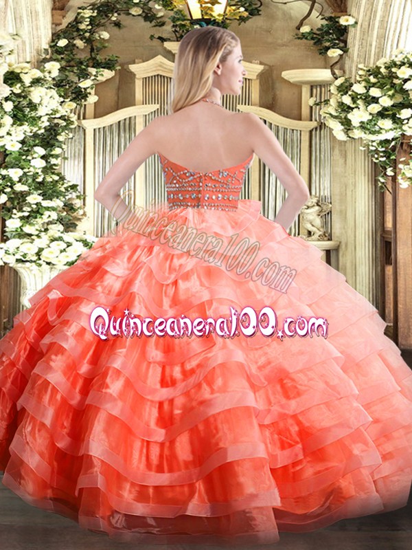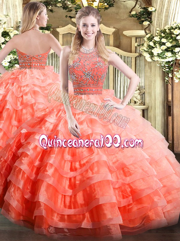 Neckline : Halter topShown Color : Orange RedSilhouette : Ball GownsSleeve Length : sleevelessHemline : floor lengthBack Detail : ZipperFabric : OrganzaEmbellishment : Beading,Ruffled LayersOccasion : Military Ball,Sweet 16,QuinceaneraSeason : Spring,Summer,Fall,Winter