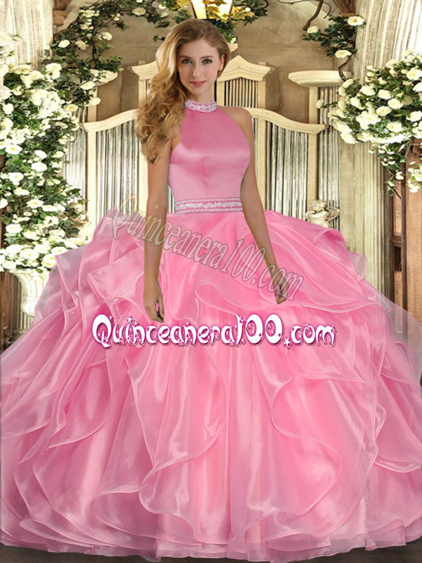 Neckline : Halter topShown Color : Watermelon RedSilhouette : Ball GownsSleeve Length : sleevelessHemline : floor lengthBack Detail : BacklessFabric : OrganzaEmbellishment : Beading,RufflesOccasion : Military Ball,Sweet 16,QuinceaneraSeason : Spring,Summer,Fall,Winter
