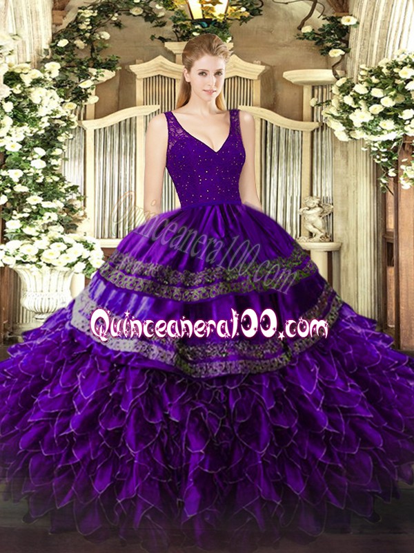 Neckline : V-neckShown Color : PurpleSilhouette : Ball GownsSleeve Length : sleevelessHemline : floor lengthBack Detail : ZipperFabric : OrganzaEmbellishment : Beading,RufflesOccasion : Sweet 16,QuinceaneraSeason : Spring,Summer,Fall,Winter