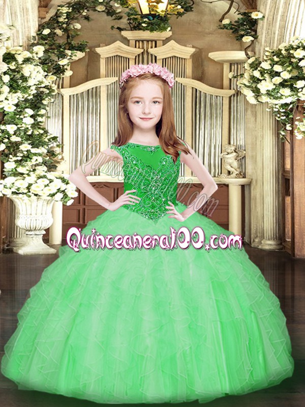 Neckline : ScoopShown Color : Apple GreenSilhouette : Ball GownsSleeve Length : sleevelessHemline : floor lengthBack Detail : ZipperFabric : OrganzaEmbellishment : Beading,RufflesOccasion : Party,QuinceaneraSeason : Spring,Summer,Fall,Winter
