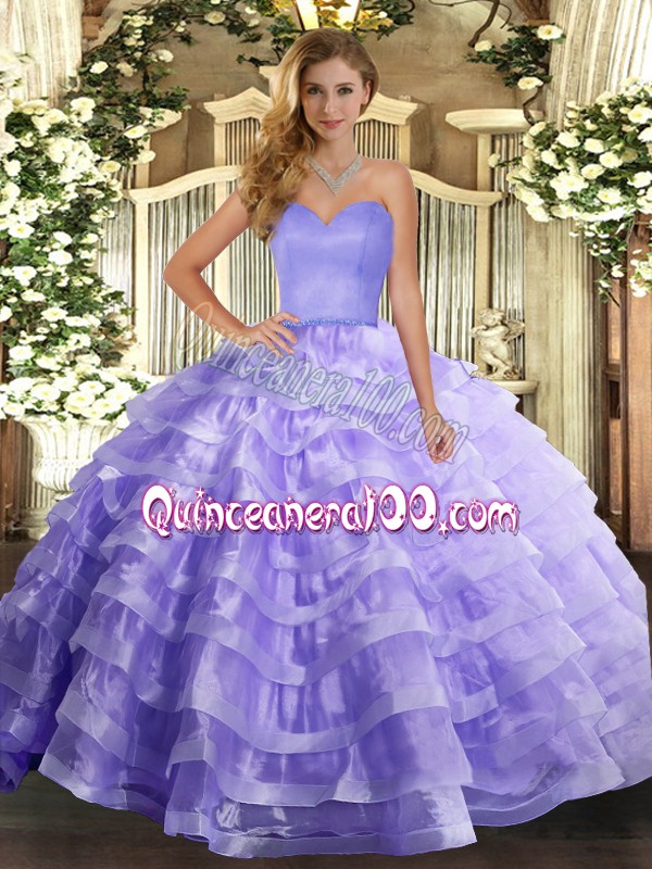 Neckline : SweetheartShown Color : LavenderSilhouette : Ball GownsSleeve Length : sleevelessHemline : floor lengthBack Detail : Lace upFabric : OrganzaEmbellishment : Ruffled LayersOccasion : Military Ball,Sweet 16,QuinceaneraSeason : Spring,Summer,Fall,Winter