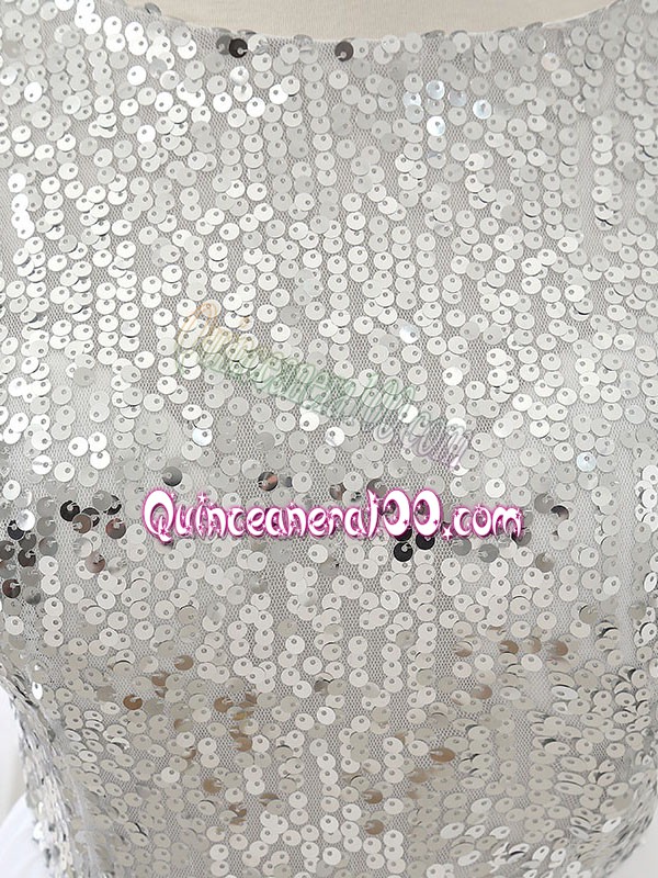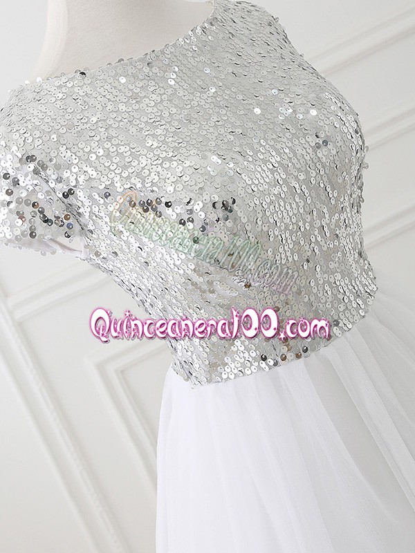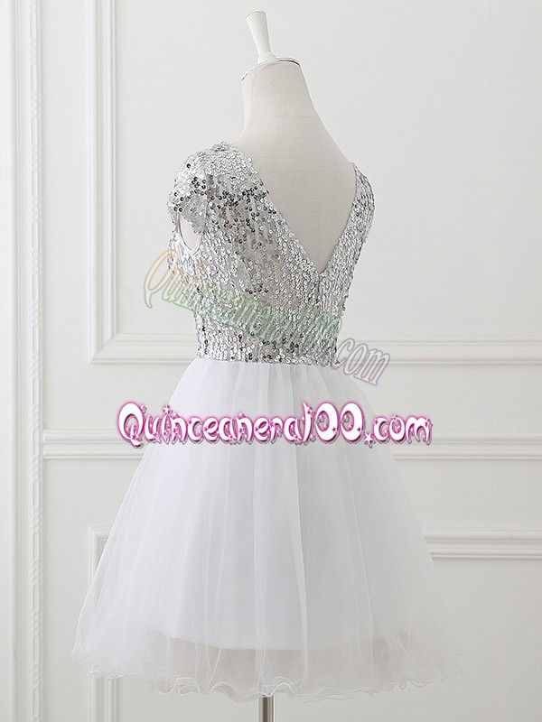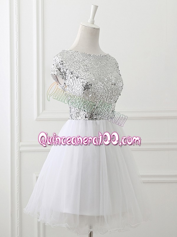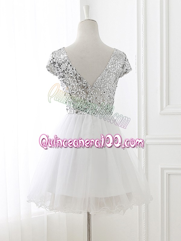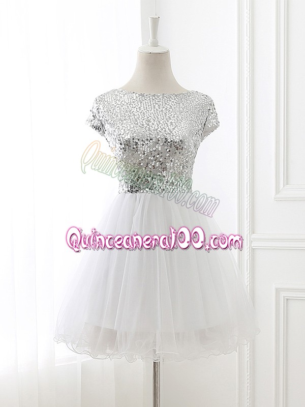 Neckline : ScoopShown Color : WhiteSilhouette : A-lineSleeve Length : cap sleevesHemline : mini lengthBack Detail : ZipperFabric : TulleEmbellishment : SequinsOccasion : Prom,Party,Wedding PartySeason : Spring,Summer,Fall
