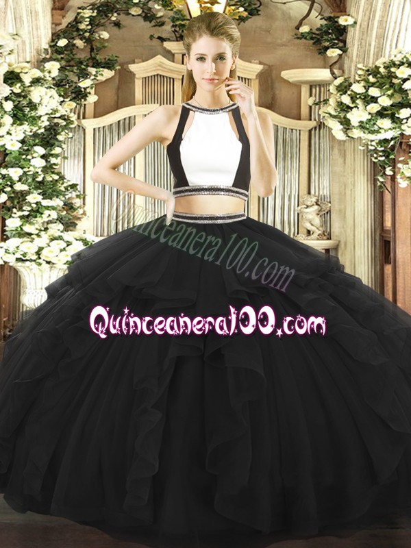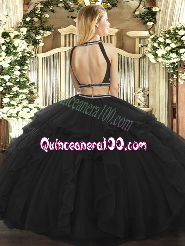 Neckline : Halter topShown Color : BlackSilhouette : Two PiecesSleeve Length : sleevelessHemline : floor lengthBack Detail : BacklessFabric : TulleEmbellishment : Ruffled LayersOccasion : Military Ball,Sweet 16,QuinceaneraSeason : Spring,Summer,Fall,Winter