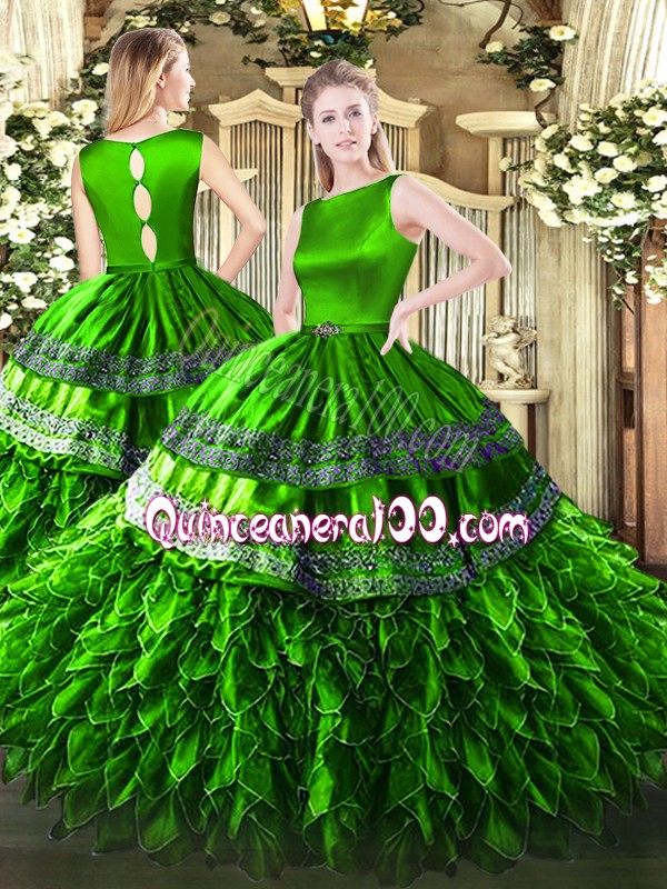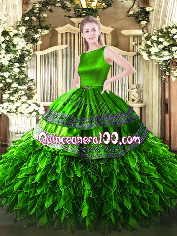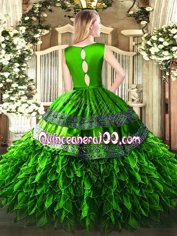 Neckline : ScoopShown Color : GreenSilhouette : Ball GownsSleeve Length : sleevelessHemline : floor lengthBack Detail : Clasp handleFabric : Satin,OrganzaEmbellishment : RufflesOccasion : Military Ball,Sweet 16,QuinceaneraSeason : Spring,Summer,Fall,Winter
